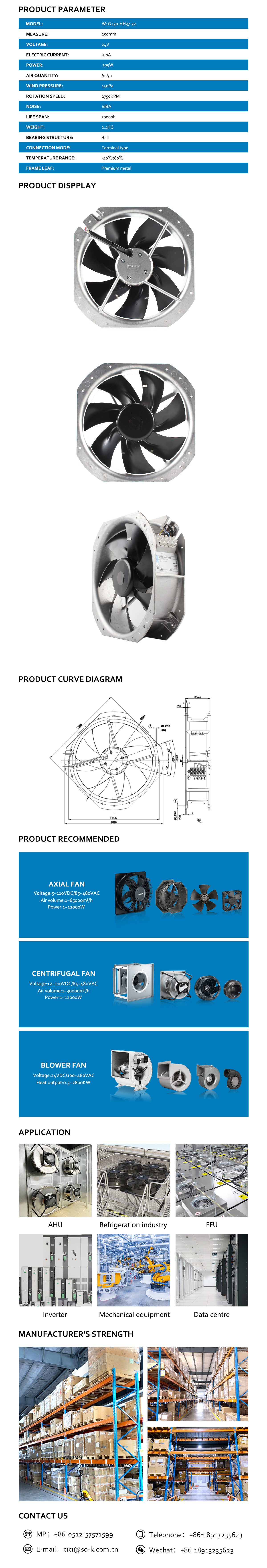 ebmpapst axial fan dc 24v axial fan motor 250mm 5.0A 105W W1G250-HH37-52